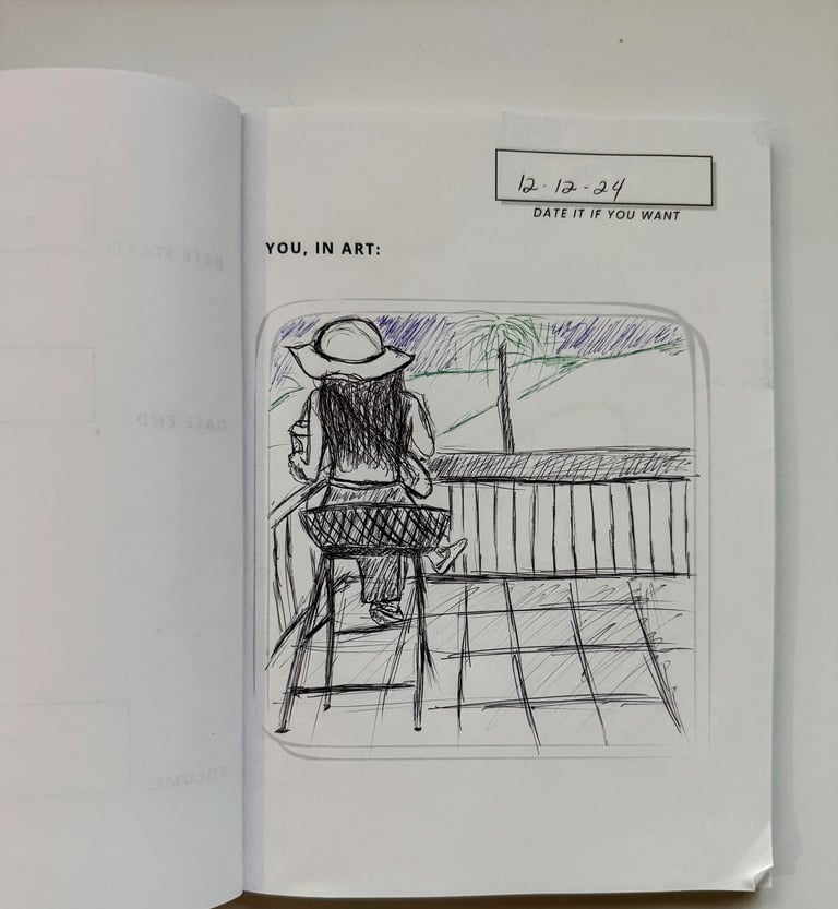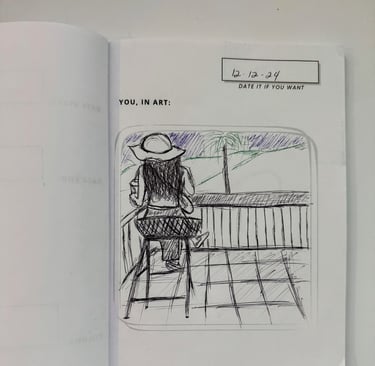 Later, as I got ready to post my feelings about this prompt, I took another look at the picture that inspired my "You, In Art" prompt. I looked closely at the cup to the left of me and realized—it’s an ice cream cup. Then I remembered that right behind where I was sitting was a specialty Toffee ice cream store that probably had its AC blasting. The rest of my family, in said store enjoying their tasty frozen treats, and there I am… this tiny human, sitting out in the hot, hot desert heat, eating said ice cream. I do believe I was trying to enjoy my cold ice cream more in the hot weather. So. Not. Deep. The picture I drew, and the photo itself make me laugh now.